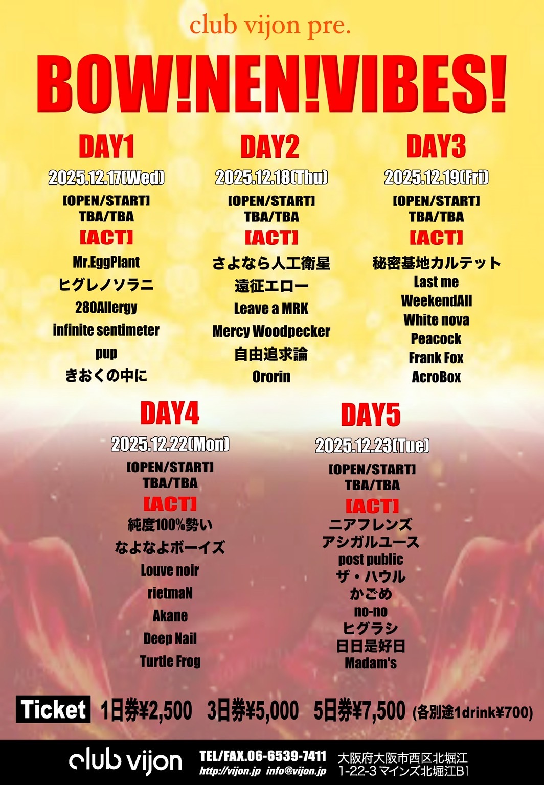 1日券¥2,500/3日券¥5,000/5日券¥7,500 (それぞれ別途1drink¥700頂戴します。)